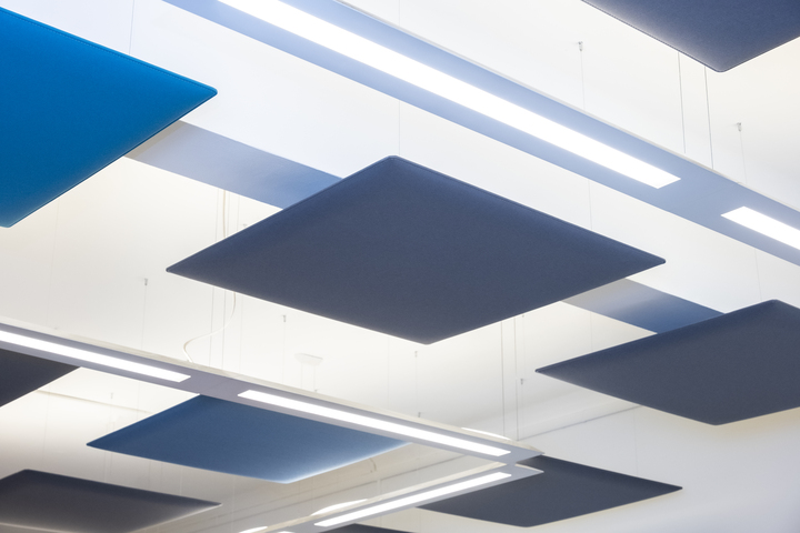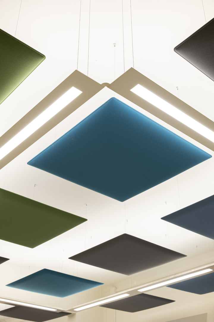 The supply included 35 Design ECO Quadro panels in the single-sided version in different shades of color and measuring 120x120 cm. The unique feature of these panels is that they allow excellent absorption at medium-high frequencies, Class A sound absorption according to UNI EN ISO 11654, and at the same time guarantee exceptional simplicity and speed of installation thanks to the rear system consisting of the aluminum reinforcement bar. This bar is inserted already in the production phase and is prepared with the appropriate holes for fixing the ceiling panels by means of plasticized steel cable kits.